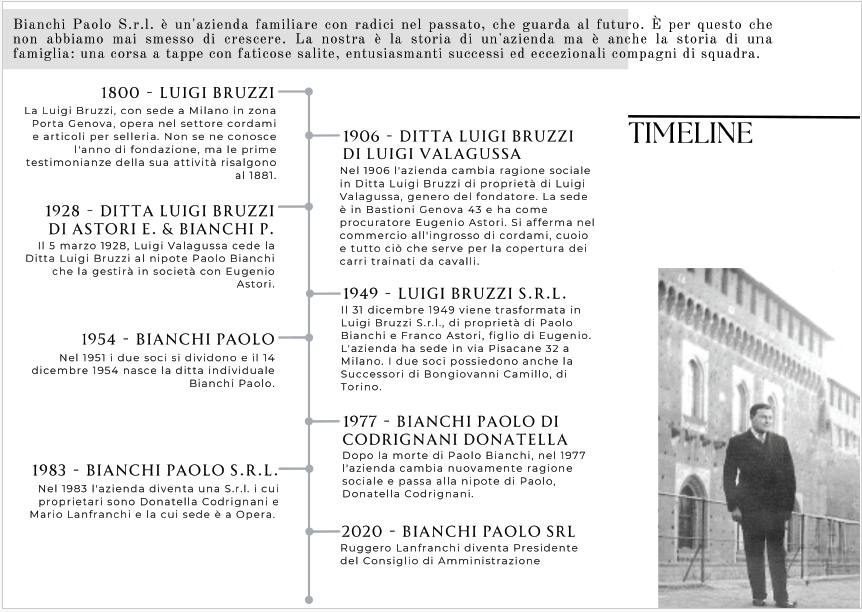 Nei decenni, Bianchi Paolo è stata contraddistinta da tanti cambiamenti e successi. È stata, per esempio, la prima azienda a importare in Italia, negli anni Sessanta, i tessuti spalmati in PVC, con diverse finiture e per diversi utilizzi come teloni da camion, capannoni pressostatici, tensostrutture e tendo-strutture, capannoni agricoli, silos, serre, portoni industriali, copripiscine, gazebo, tende da sole, copri barca.
