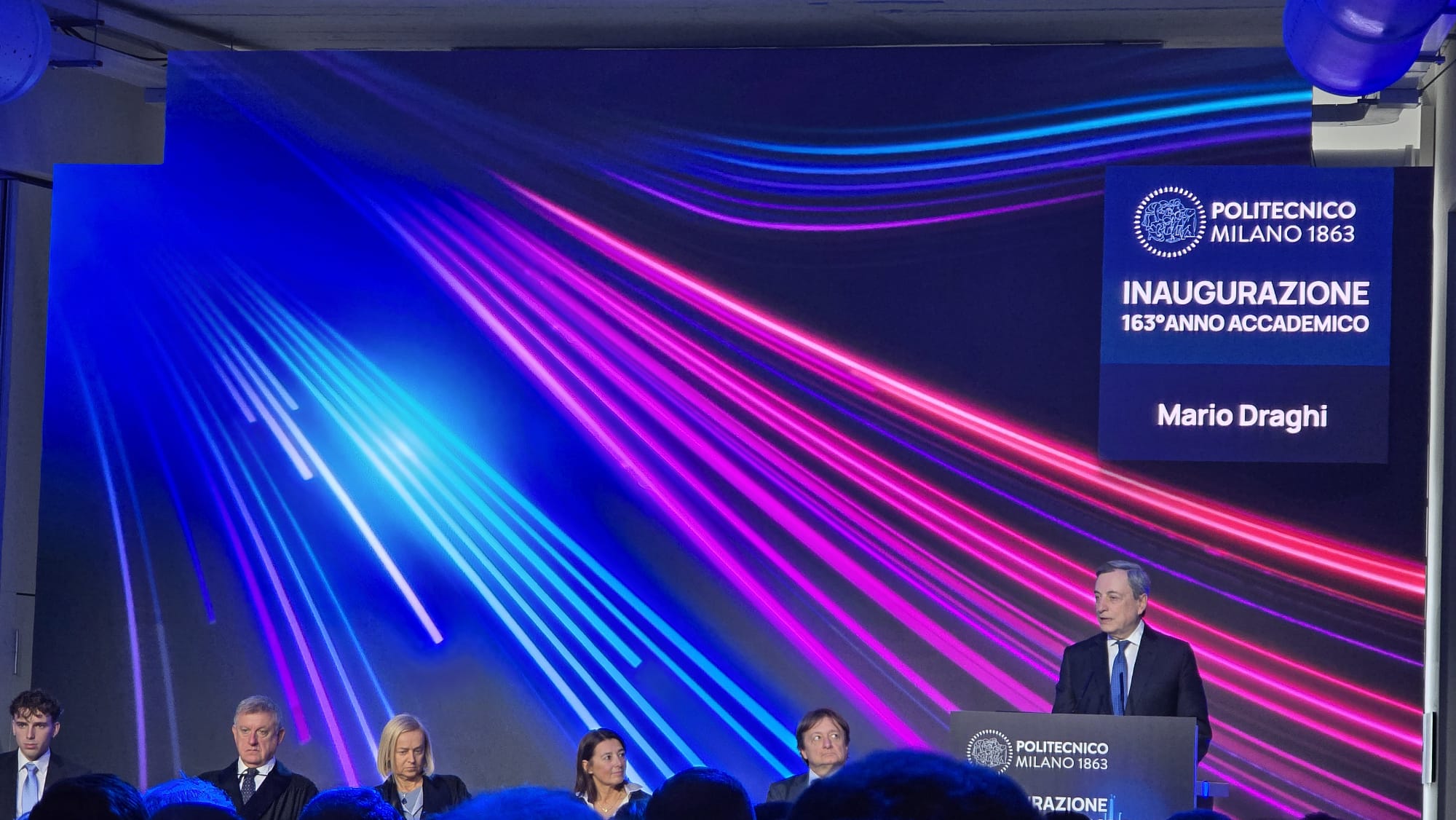 Insieme alla Rettrice, hanno preso parte alla cerimonia di inaugurazione dell’Anno Accademico Giuseppe Sala, Sindaco di Milano, Alessandro Fermi, Assessore all’Università, Ricerca, Innovazione della Regione Lombardia, Michele Gaetano Giussani, Presidente del Consiglio degli Studenti, Politecnico di Milano, Mario Draghi.